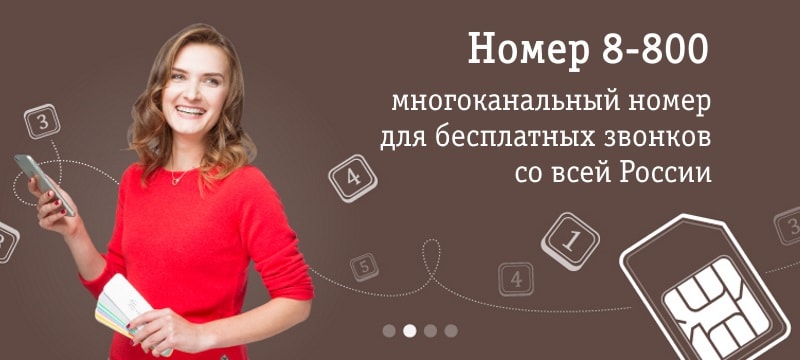 Номер 8-800 — это многоканальный номер для бесплатных звонков Ваших клиентов со всей России. Клиенты смогут звонить Вам бесплатно из любой точки нашей страны с городского или мобильного телефона. Выберите красивый запоминающийся номер, и он принесет Вам больше звонков. Благодаря многоканальности Вы не пропустите ни одного входящего звонка и заинтересованного клиента — это поможет увеличить продажи. Умный автоответчик облегчит работу колл-центра, направив вызов нужному специалисту, а наглядная статистика звонков поможет Вам следить за качеством работы и загрузкой менеджеров. Добивайтесь лучших результатов для Вашего бизнеса с услугой «Номер 8-800».